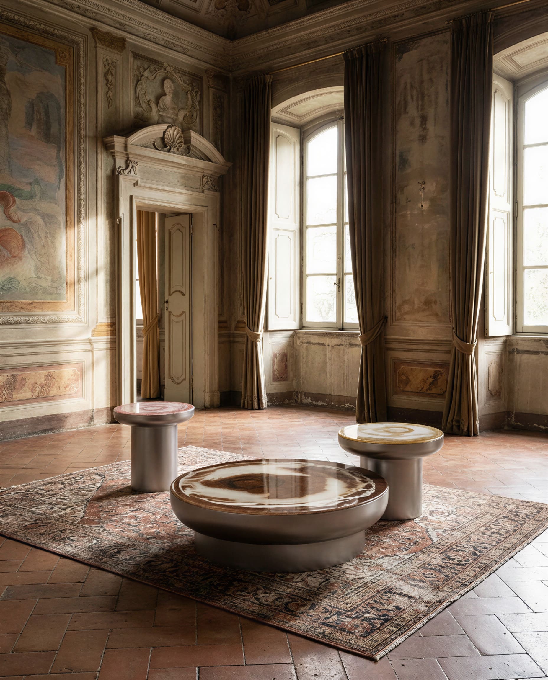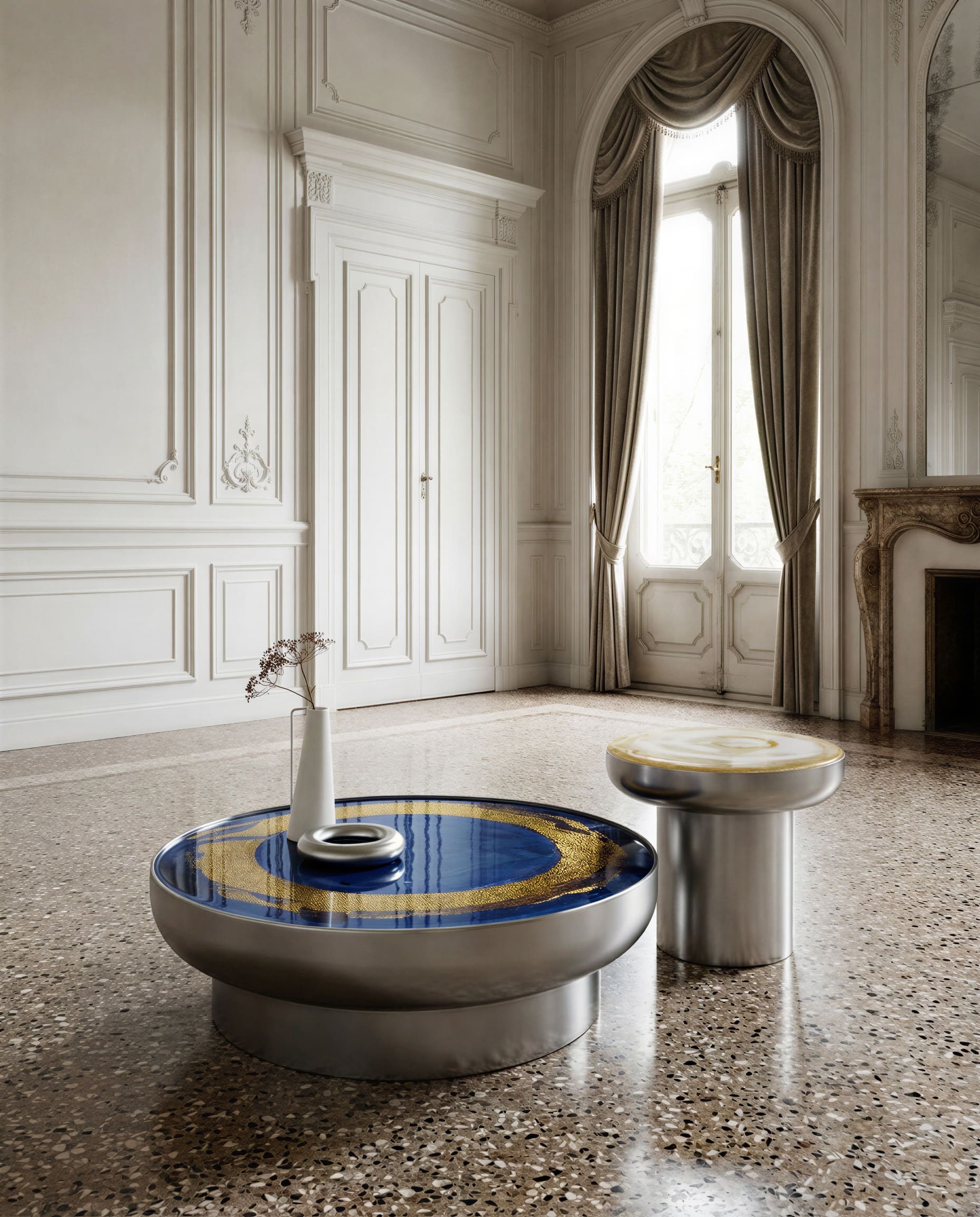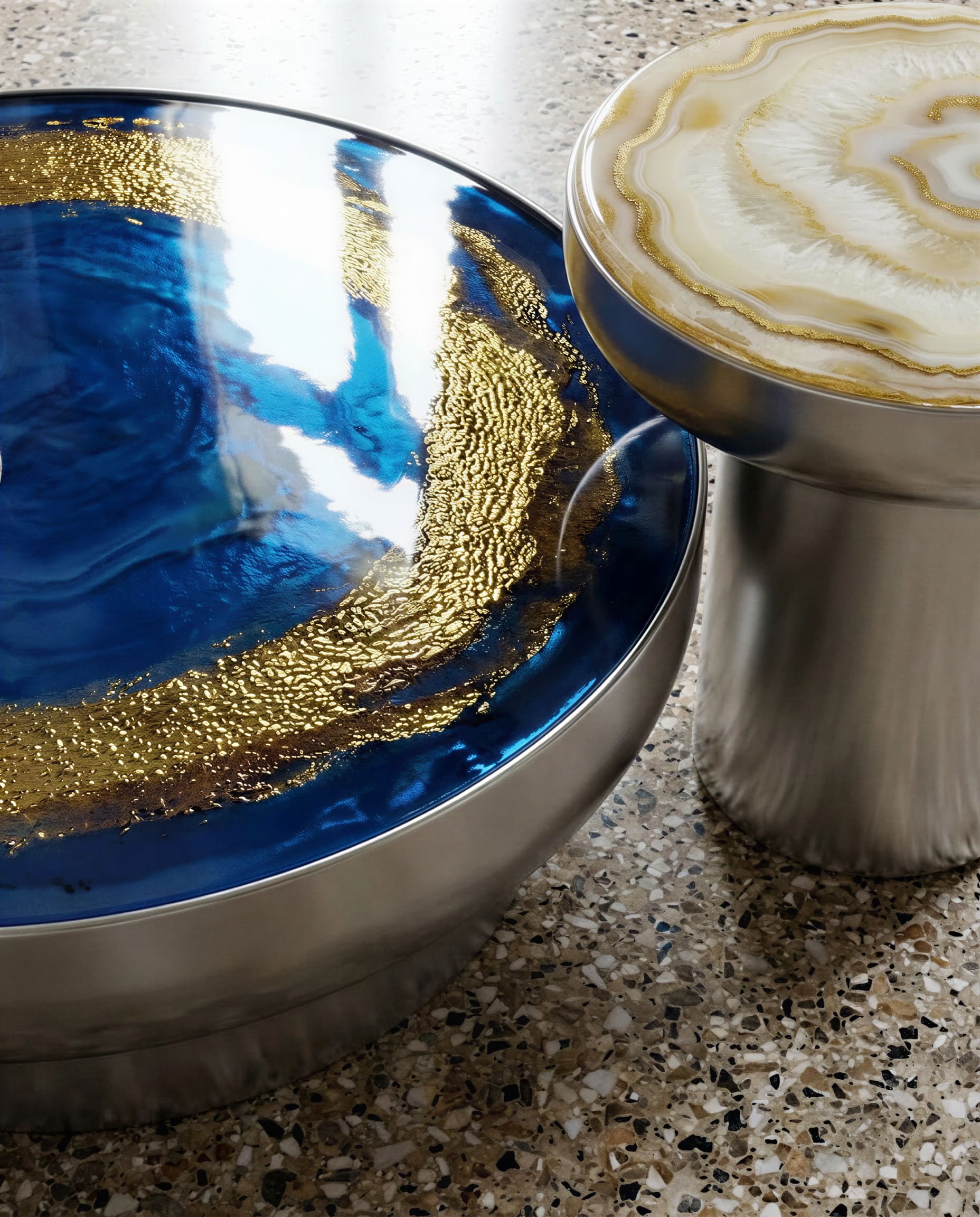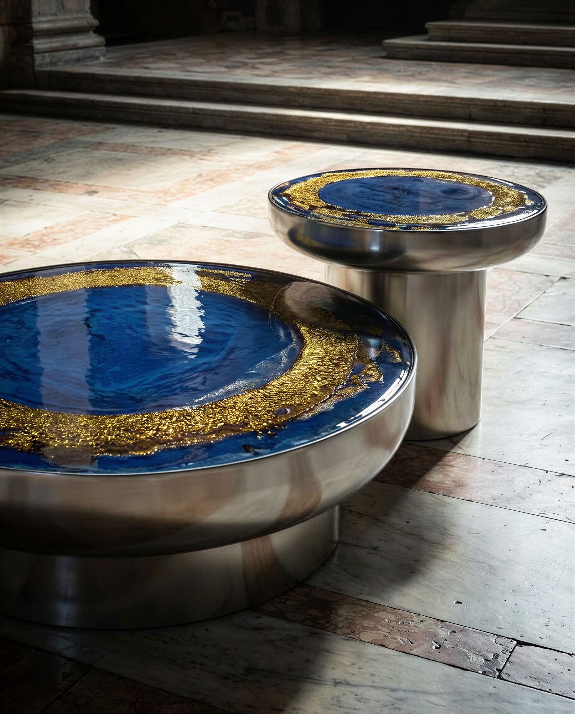 The tabletop surface evokes the state of water’s surface tension – like a drop suspended in perfect balance. Thus, glass becomes a metaphor for form itself, where invisible effort turns into visible harmony. Each tabletop is finished by hand: the enameling process draws on traditional Venetian techniques, giving every piece its own unique tone, texture, and vibrant play of light that creates an emotional pattern across the surface.